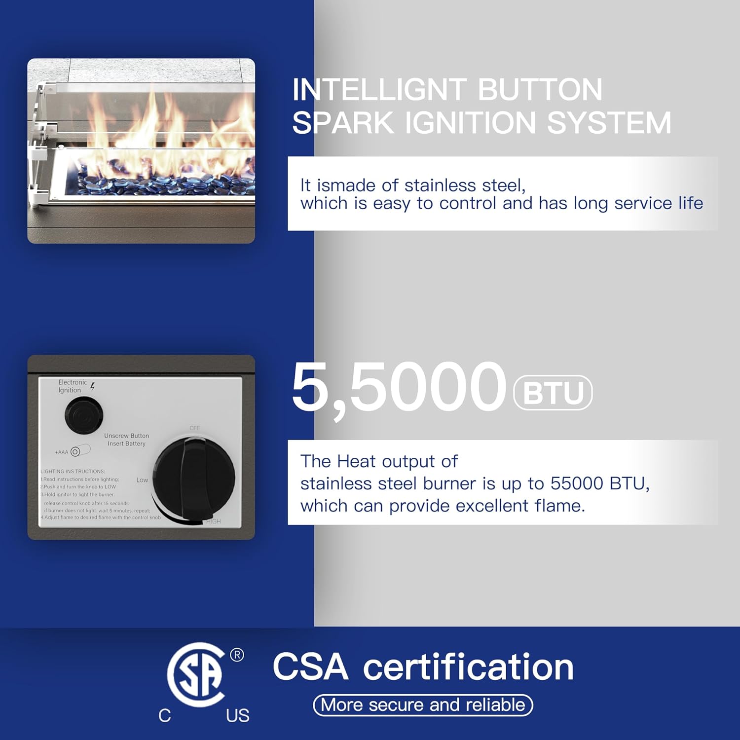 - CSA APPROVED AND SAFETY- Gas fire pit table has passed the most dynamic safety certification in North America. It not only has an upgraded version of dual pipe burner to make combustion more uniform, but also has the highest safety standard of 55000 BTU stainless steel burner rated power to provide the most sufficient flame. Our fire pit table uses propane fuel, clean and pollution-free