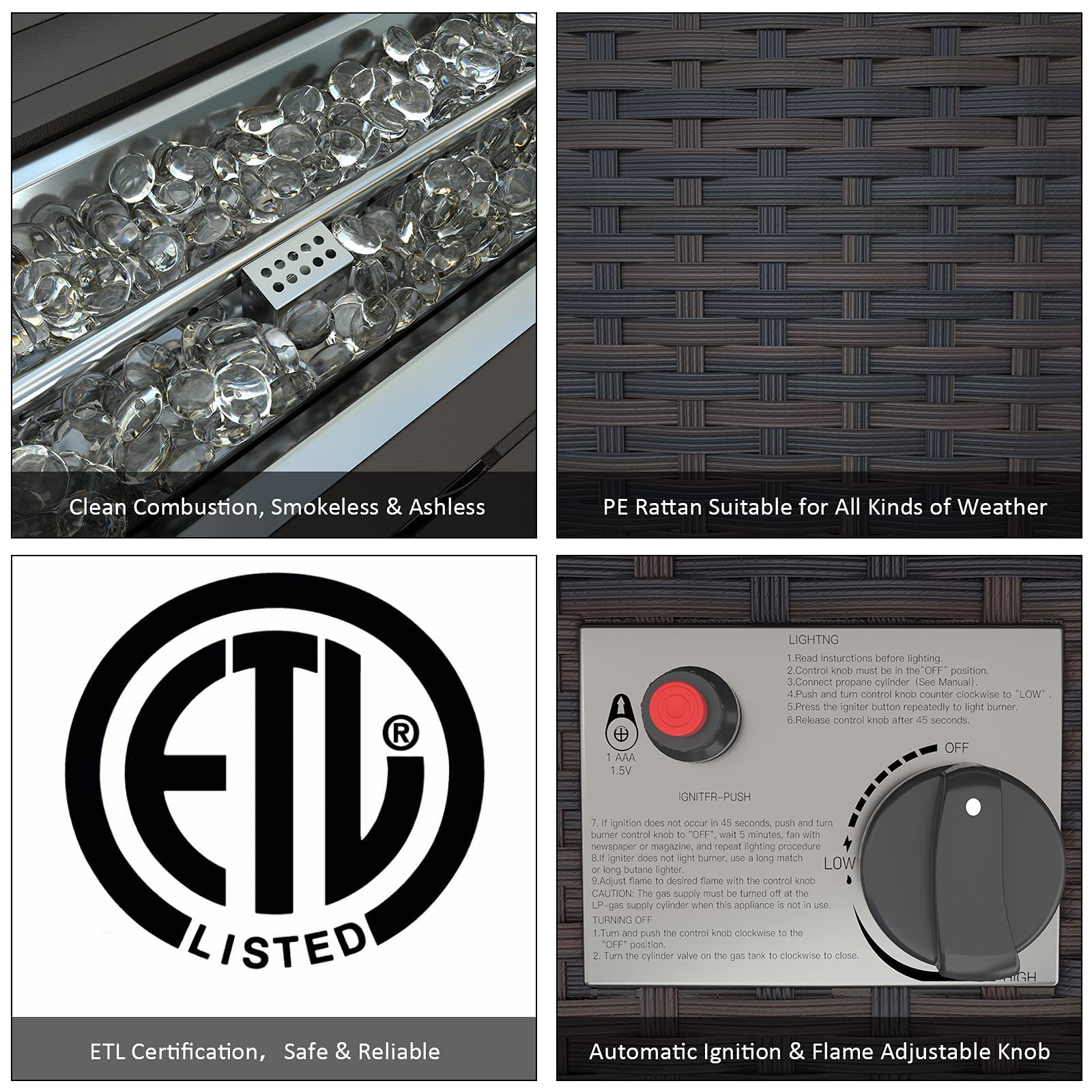 Upgrade your patio with the ALAULM 43" outdoor propane gas fire pit table. Delivering 50,000 BTU of smokeless warmth, this ETL-certified fire pit features a rust-resistant aluminum top, durable PE rattan base, glass wind guard, and adjustable flame control. Perfect for year-round outdoor gatherings, with waterproof cover and glass stones included. Easy to assemble, safe, and built for lasting performance.