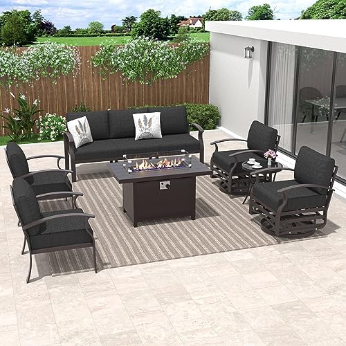 ALAULM 7-Seat Aluminum Patio Furniture Set with CSA-Certified Fire Pit Table & Swivel Chairs