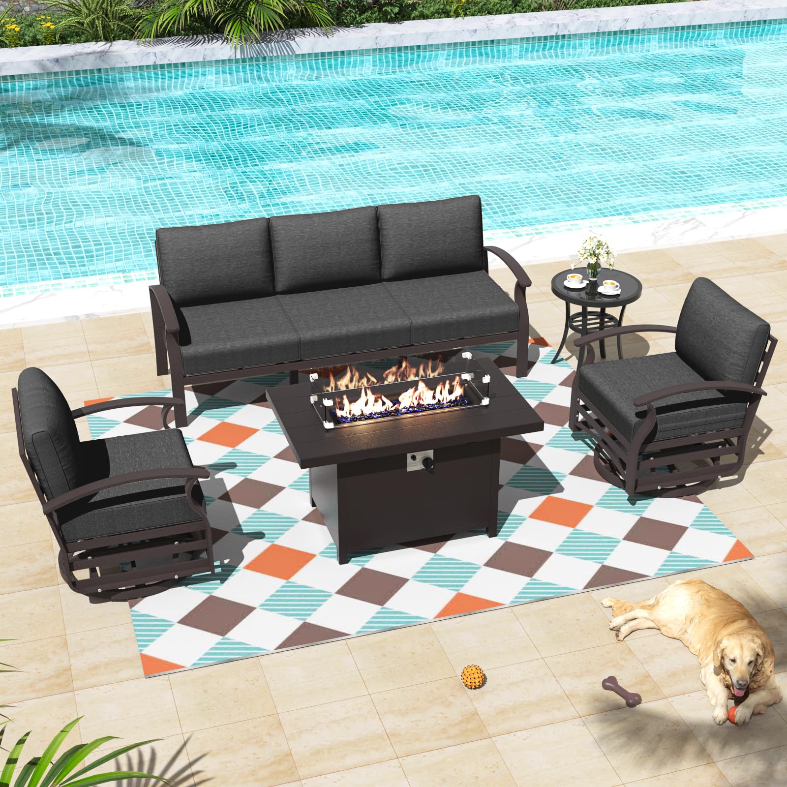 ALAULM 5-Seat Aluminum Patio Furniture Set with CSA-Certified Fire Pit Table & 5.1" Cushions