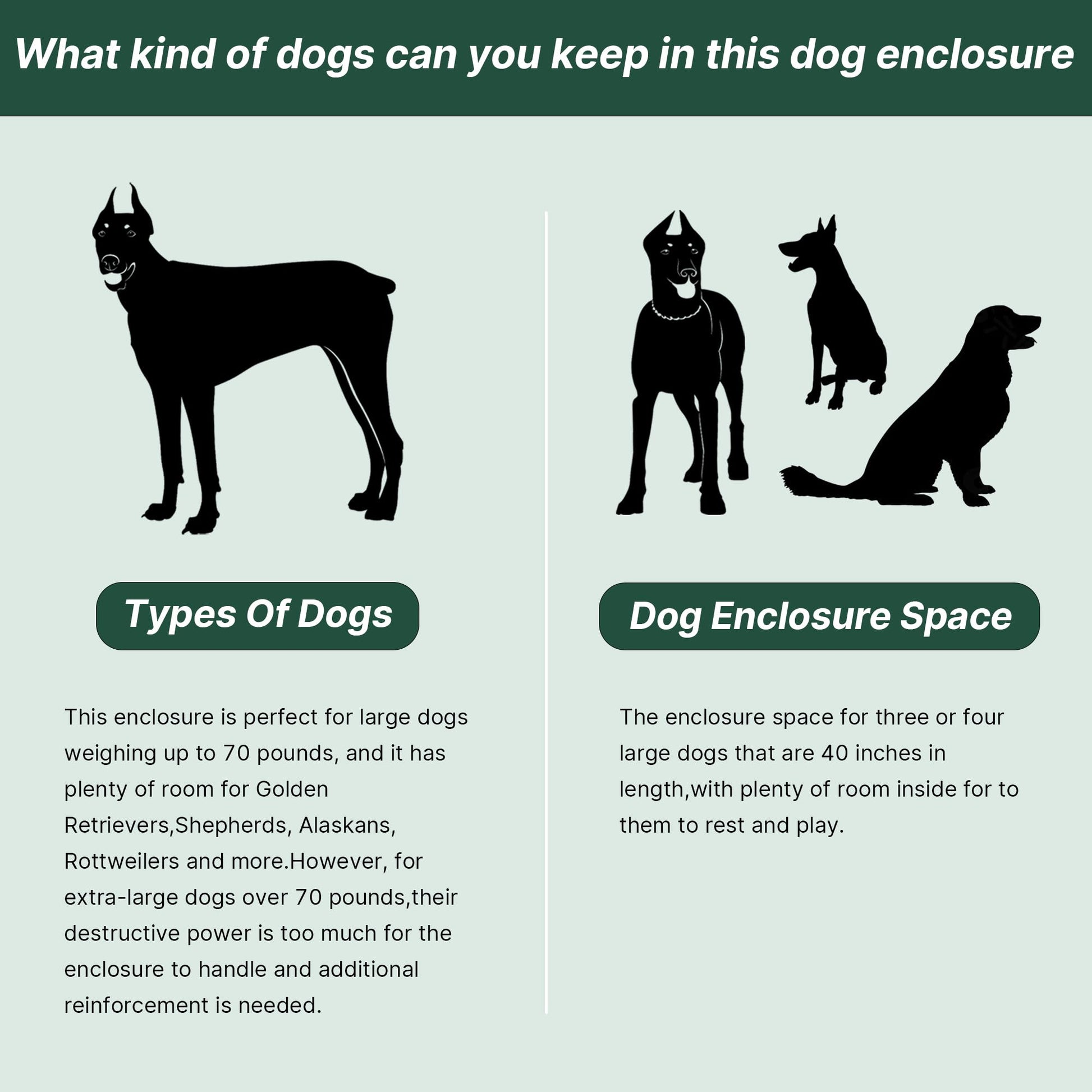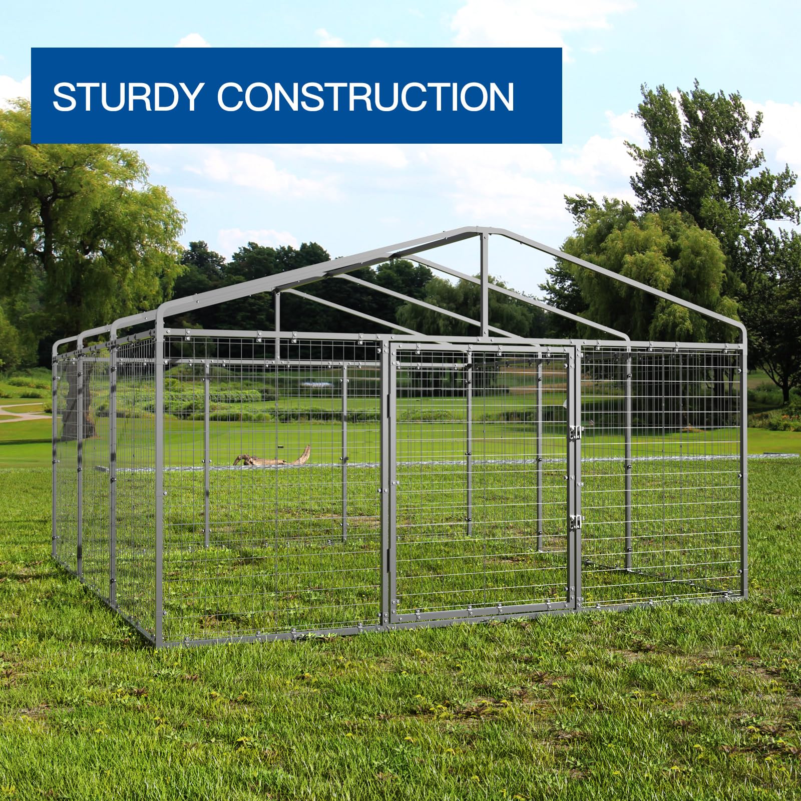 The kennel is 118" x 118" x 70", giving plenty of space for medium to large breeds to move around comfortably.